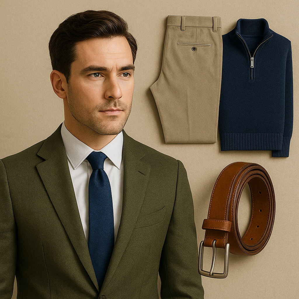 جاكيت بني أنيق بتصميم خالد وتفاصيل عصرية. يتميز بياقة محبوكة، وجيوب بسحاب، وشعار معدني على الصدر. مثالي لإطلالة شبه رسمية.